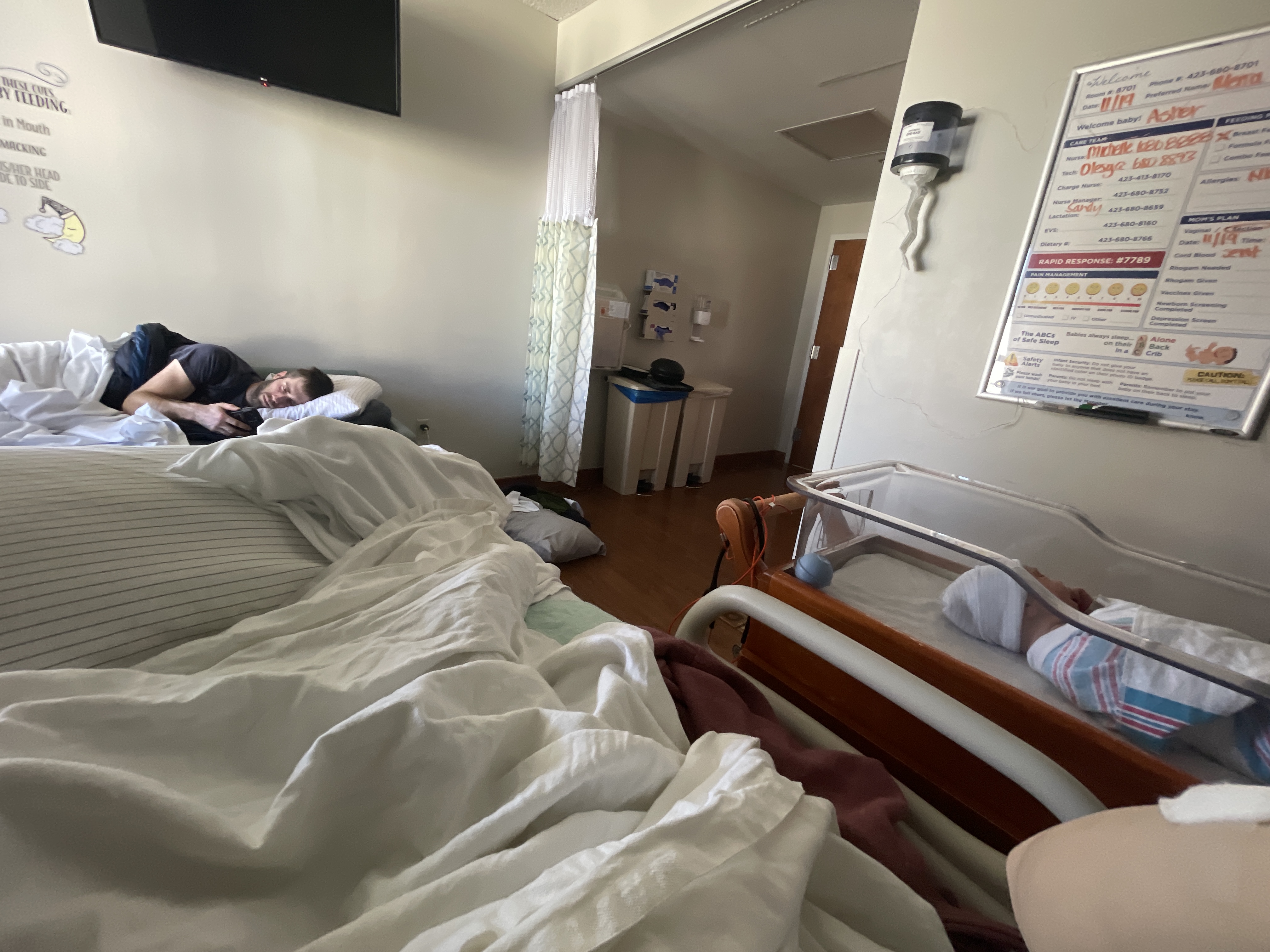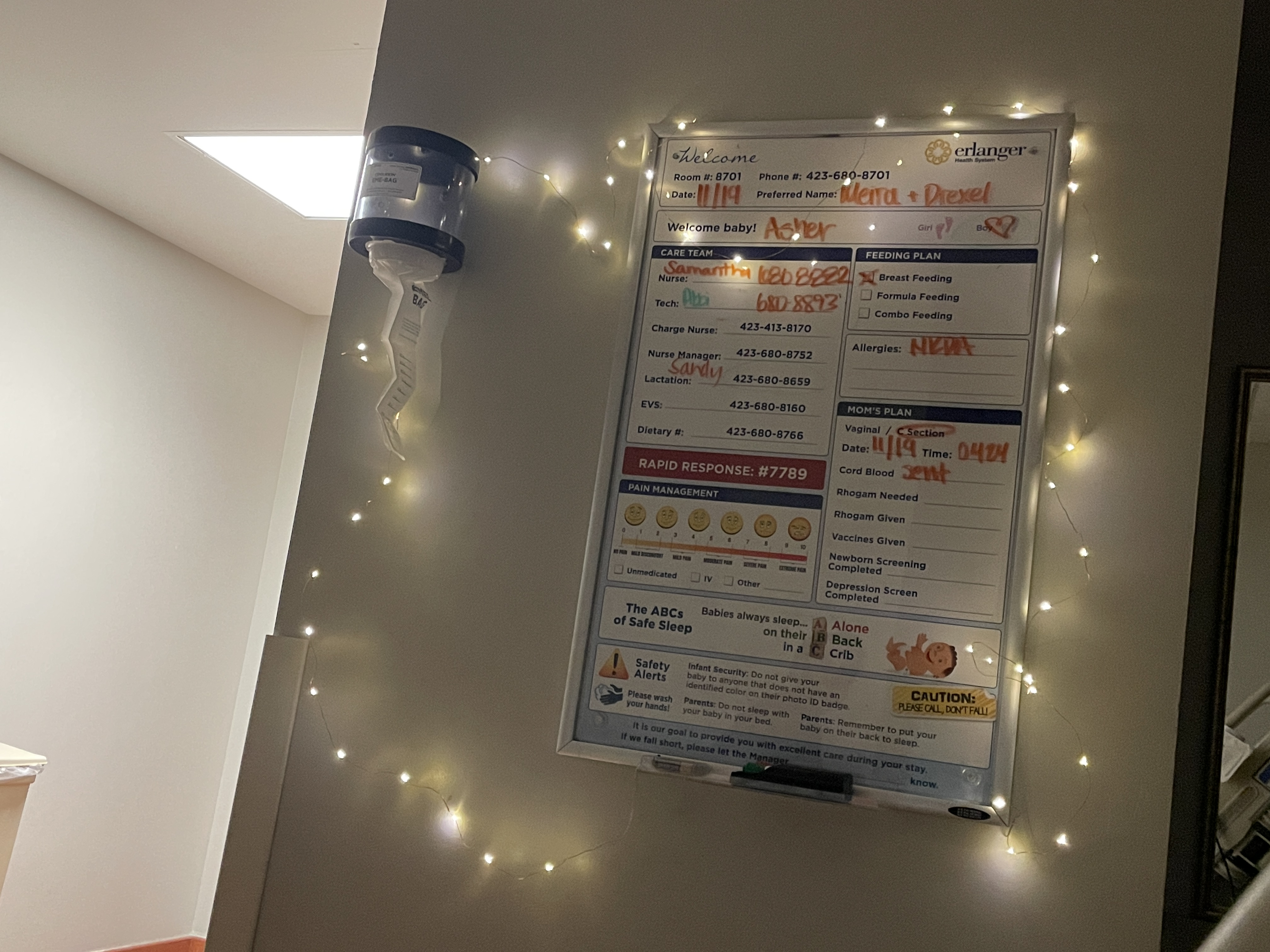 There are two shifts, AM & PM. I believe shift change happened at 8am and 8pm(?). For each shift, you’ll have a primary nurse and a tech who are assigned to you. I believe each of these nurse/tech teams is responsible for a crew of up to 8 rooms (24 rooms, so potentially 3 different teams depending on how full the unit is at the time). These are the main people you will see during your visit, aside from a lactation consultant who works with all moms as needed. Your nurse/tech team will check on you and baby every 2-4 hours or so, taking both of your vitals to make sure everything is going okay. Other visitors might include your pediatrician, an Erlanger photographer (who wants to tell you all about their sweet deal of only $50 per photo lol), cleaning staff, hospital admin staff to get paperwork signed, somebody who randomly comes by with a free snack cart, and your OBGYN/midwife. If they ask to bring a student observer into your room, you have the right to say no thanks.
